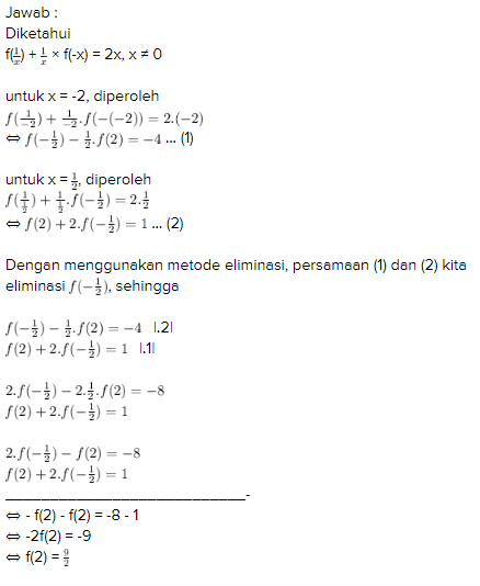 Misalkan fungsi f memenuhi f() +  × f(-x) = 2x, setiap x ≠ 0, maka tentukan nilai f(2)!