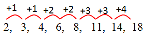7.  Dua suku berikutnya dari barisan 2, 3, 4, 6, 8, 11, … adalah …