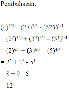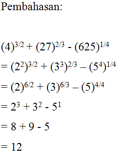 1. (4)3/2 + (27)2/3 – (625)1/4 = ….