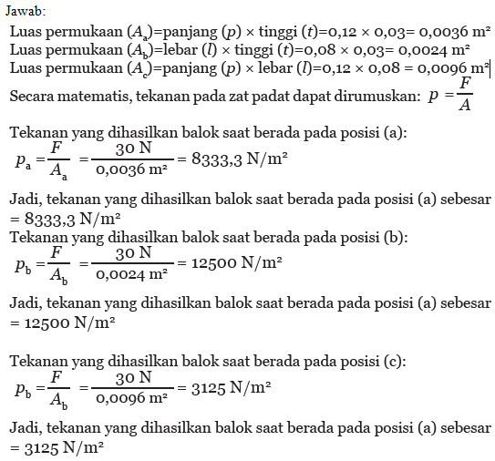dan gaya tekan. Dimana rumus untuk mencari tekanan zat padat adalah P = F/A.