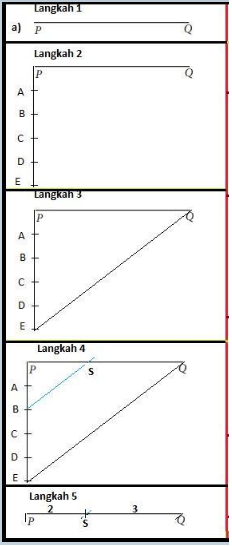 2) Dari titik P, buatlah garis PE dengan ukuran 5 bagian yang sama sedemikian