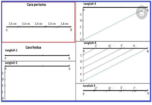 Dengan demikian, terbagilah ruas garis AB menjadi 5 bagian yang sama yaitu