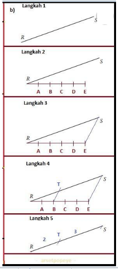 2) Dari titik R, buatlah garis RE dengan ukuran 5 bagian yang sama sedemikian