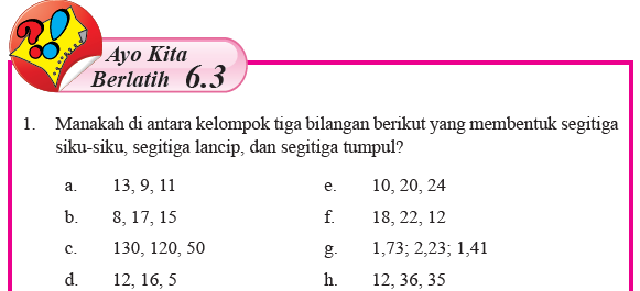 1. Manakah diantara kelompok tiga bilangan yang membentuk segitiga siku siku ,