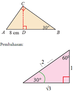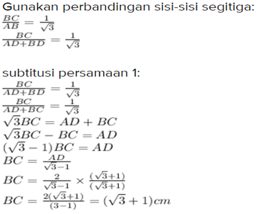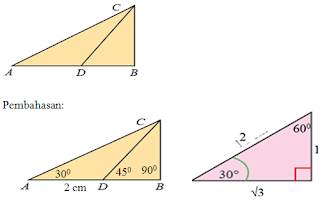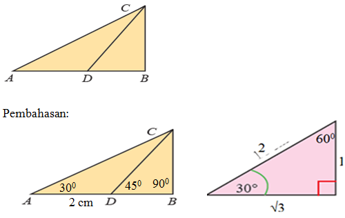 ∠CDB = 45°, ∠CAB = 30°, dan AD = 2 cm. Tentukan panjang BC!