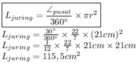Jadi, luas juring lingkaran dengan jari jari 21 cm dan sudut pusat 30° adalah 115,5 cm²