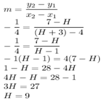Diketahui : x1 = 4 , y1 = h dan x2 = h + 3 , y2 = 7 , dan m = -1/4